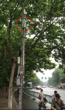 隨附圖片:紅色圓圈標注處即為上海貝爾在南京市區(qū)電線桿上部署的lightRadio?靈云無線微基站